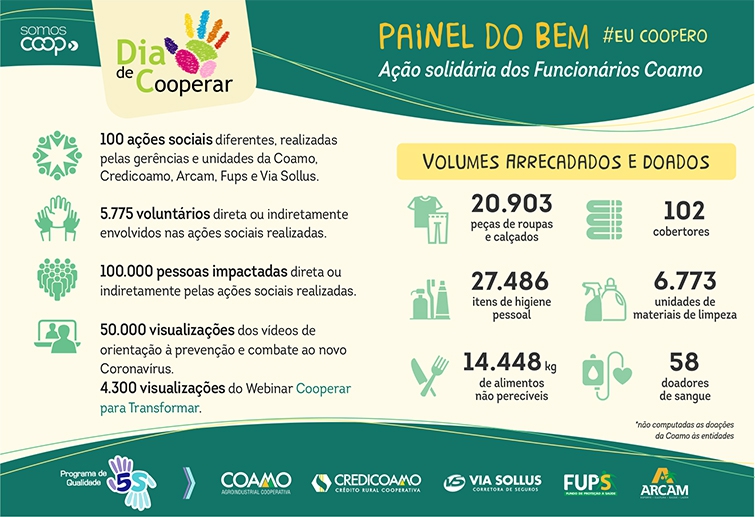 No total, foram mais de 100 ações sociais organizadas e executadas por 5.775 voluntários/funcionários da Coamo, Credicoamo, Arcam, Fups e Via Sollus. Entre os produtos arrecadados e doados estão 27.486 itens de higiene pessoal, 20.903 peças de roupas e calçados, 14.448 quilos de alimentos não perecíveis, 6.773 unidades de materiais de limpeza, 102 cobertores. Outra atividade organizada pelo programa 5S é a coordenação de voluntários para doação de sangue. No primeiro semestre foram 58 doadores.
