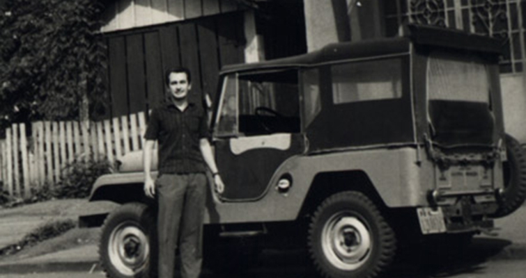 | Gallassini com o jipe usado no trabalho de extensionista |
