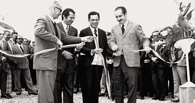 | Solenidade de lançamento da pedra fundamental do primeiro armazém, com a presença do presidente da Coamo, Fioravante João Ferri, do prefeito municipal Renato Fernandes Silva, do deputado estadual Armando Queiroz de Moraes e do secretário da Agricultura do Paraná, Cassiano Gomes dos Reis. |