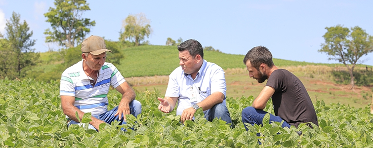 | Cooperados Jair Marconi e Jair Felipe, pai e filho, dizem que as sobras incentivam a parceria com a Coamo. Na imagem eles acompanham o desenvolvimento da safra com o engenheiro agrônomo, João Rafael Bauermeister |