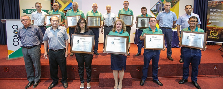 Com 40 anos de Coamo receberam homenagens os funcionários: Dorli Célio Sontag e Luiz Flávio Avanzi, de Fênix, Francisco de Assis Oliveira, de Quinta do Sol, Antonio Gilmar Schiessl, de Palmas, e José Bolivar Pedroso, José Carlos Bertipalha, Maria Luiza Lopes, José Valdir Zwirtes e José Aparecido Pavão (em memória), de Campo Mourão.