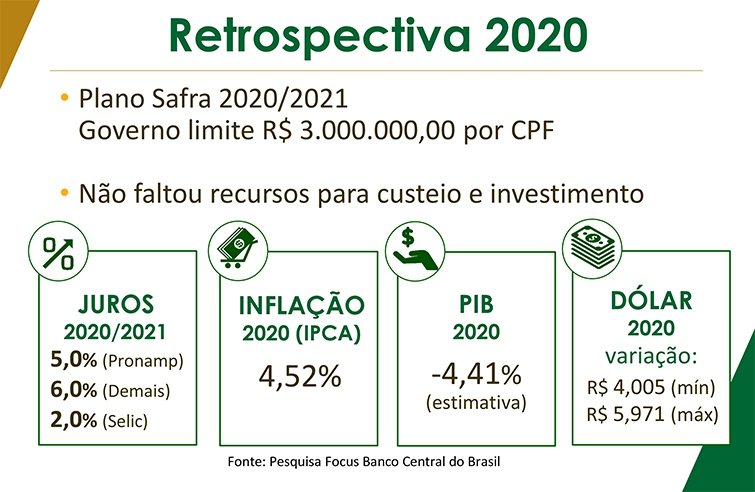 No Plano Safra 2020/2021, o governo estabeleceu limite de R$ 3.000.000,00 por CPF. Não faltaram recursos para custeio e investimento da safra. Os juros foram 5,0% para o Pronamp, 6,0% aos demais e 2,0% de Selic. A inflação foi de 4,52% e o PIB de -4,41%. O dólar variou de R$ 4,005 a R$ 5,971.