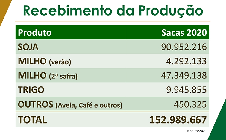 A Coamo recebeu no ano passado um total de 152.989.667 sacas de produtos agrícolas. Foram 90.952.216 de soja, 4.292.133 de milho verão, 47.349.138 de milho segunda safra, 9.945.855 de trigo. Outros produtos, como aveia e café, somaram 450.325 sacas. “É uma grande safra. Poucas empresas recebem esse montante”, assinala Gallassini.