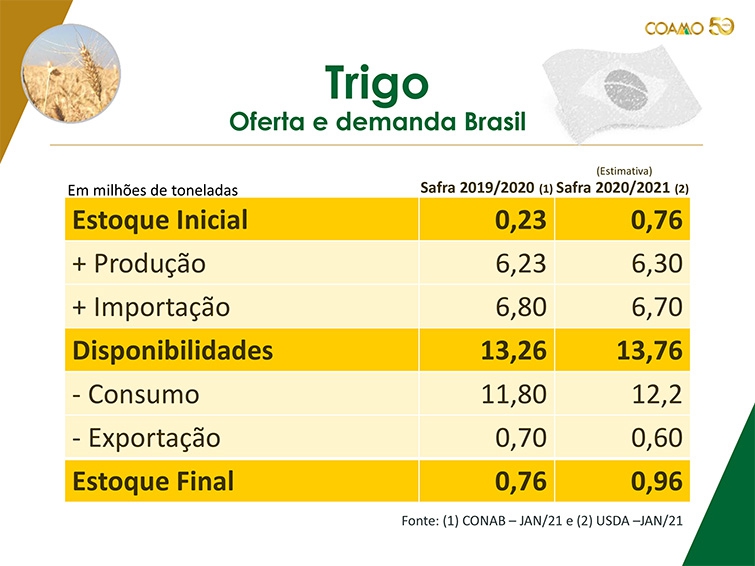 A quebra na safra 2019 de trigo fez com que aumentasse a necessidade de importação no primeiro semestre de 2020. Porém, com baixa disponibilidade da Argentina e desvalorização cambial, o Brasil zerou a TEC para importação de trigo fora do Mercosul. A colheita da safra no segundo semestre não baixou os preços como se era esperado em função dos aumentos no trigo internacional e continuação da desvalorização do real. O aumento nos preços só não foi maior porque moinhos não conseguiram repassar os valores ao consumidor final e, portanto, seguem reticentes em compras alongadas.