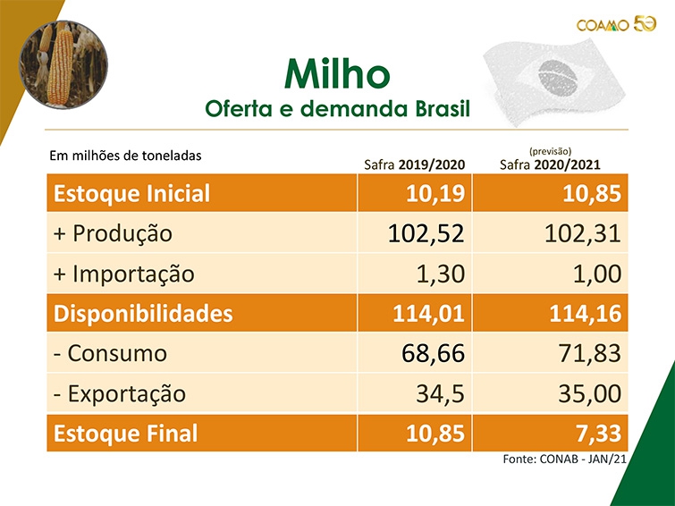 O aperto na oferta no Brasil continuará dando suporte aos preços no primeiro semestre até a entrada da safra de inverno, o que fará o preço do milho ficar mais próximo da paridade de importação do que de exportação e tendo agora como suporte adicional a seca no RS e SC afetando a safra verão. A possibilidade de importação de milho (por hora dos EUA, porque Argentina está restringindo oferta para controlar inflação).