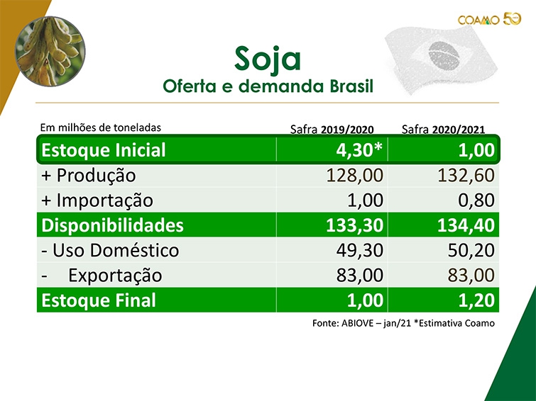 Pontos que merecem atenção e podem pressionar os preços para baixo: valorização do real frente ao dólar, demanda chinesa por carne importada menor, podem derrubar a demanda da indústria global de carnes e, consequentemente, reduzir a demanda de soja para ração, e o fim do auxílio emergencial pode derrubar o poder de compra dos consumidores e a demanda.