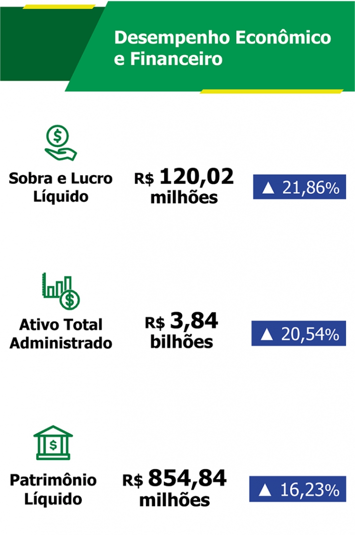 Apesar da redução das taxas de juros o desempenho econômico e financeiro da Credicoamo no exercício de 2020 foi expressivo. Fechou com 15.425 operações de crédito no montante de R$ 2,27 bilhões, crescimento de 24,73%. Esta performance está distribuída nas diversas linhas de financiamento. O ativo total administrado atingiu R$ 3,84 bilhões, representando um crescimento de 20,54% e o patrimônio líquido de R$ 854,84 milhões, uma evolução de 16,23%, em relação ao ano de 2019. A maior participação e movimentação financeira dos associados, também refletiu na captação de recursos de depósitos e aplicações financeiras, com crescimento de 79,38%.