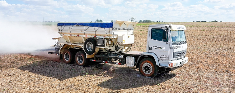 A Coamo conta com uma eficiente estrutura reunindo cerca de 90 caminhões para o fornecimento de calcário e gesso nas lavouras dos mais de 29 mil cooperados, nos Estados do Paraná, Santa Catarina e Mato Grosso do Sul.
