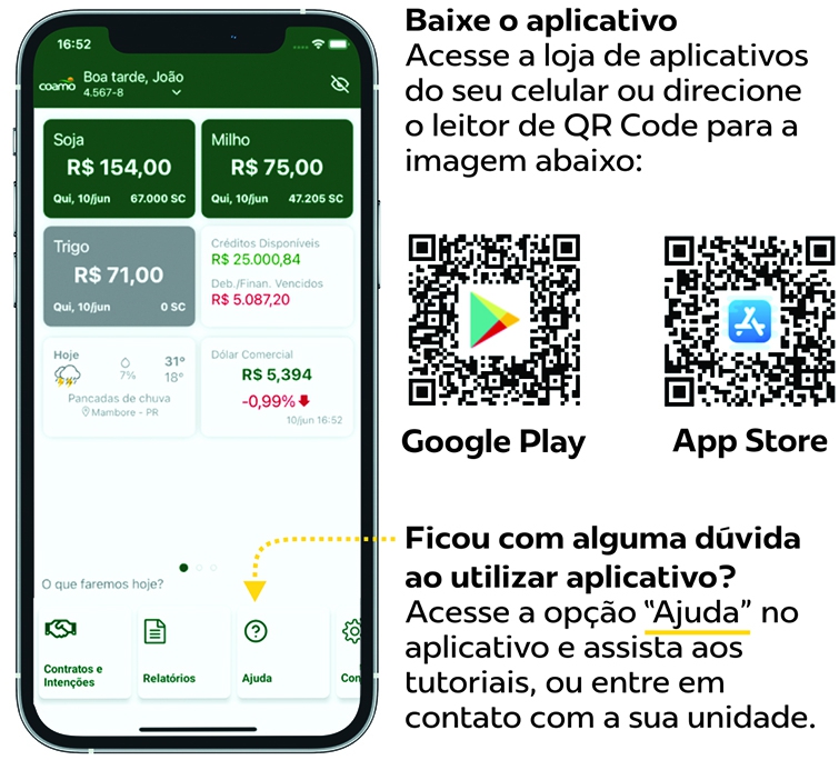 “A Coamo está sempre inovando. Esse aplicativo veio para facilitar a vida do cooperado, modernizando o atendimento. Ficou muito bom e prático para utilizar, evita ir até o entreposto só para fixar ou ver preços. Tenho várias informações ao mesmo tempo”.