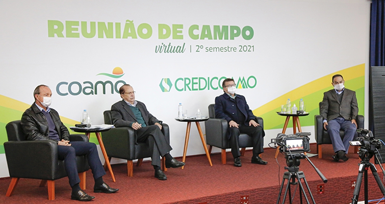 Assim como ocorreu no início do ano, a Reunião de Campo do segundo semestre foi realizada no formato virtual, transmitida pelo canal da Coamo no YouTube. O presidente dos Conselhos de Administração da Coamo e Credicoamo, José Aroldo Gallassini, coordenou a reunião que contou com a participação dos presidentes Executivos da Coamo, Airton Galinari, da Credicoamo, Alcir Goldoni e do diretor de Suprimentos e Assistência Técnica da Coamo, Aquiles de Oliveira Dias.