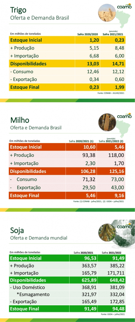 A soja é a principal cultura. Todos os países juntos deverão produzir 385,55 milhões de toneladas na próxima safra. A previsão no Brasil é de 144 milhões de toneladas, Estados Unidos 119,88 e a China 19 milhões de toneladas. “A soja é um produto importante para a Coamo, tanto para a industrialização quanto para a exportação. Os cooperados ainda têm 29,4 milhões de sacas de safras passadas armazenadas na cooperativa”, diz.