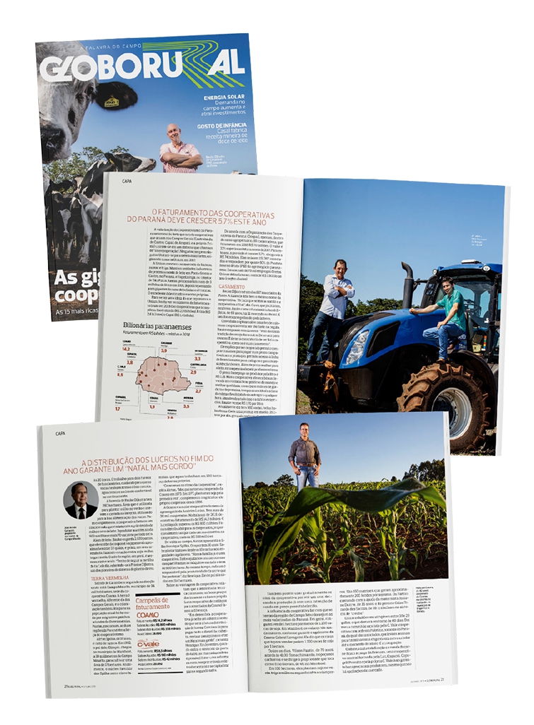 Com o crescimento das cooperativas, a renda dos cooperados também aumenta, conforme sintetizou o agricultor e associado da Coamo Airton Spilka, de Mamborê (PR): “Crescemos no ritmo da cooperativa.” O cooperado Halisson Claus Welz Lopes, de Engenheiro Beltrão (PR), também foi personagem da reportagem, assim como o presidente dos Conselhos de Administração da Coamo e Credicoamo, José Aroldo Gallassini.