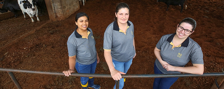 Em Manoel Ribas (Centro-Norte do Paraná), na propriedade da família Schmidt, as mulheres fazem questão de pôr a mão na massa. As cunhadas Paula, Maria e Renata, esposas dos cooperados, Éder, Edson e Elder, acordam bem cedo para ordenhar as vacas. Esse trabalho é feito três vezes ao dia, às 06, 14 e 22 horas. As três são mães e mesmo com as responsabilidades da casa, não abrem mão de fazer parte das atividades pecuárias. “Primeiro, colocamos a casa em ordem, arrumamos os filhos e fazemos o serviço de rotina. Tudo até o horário da ordenha”, comenta Paula, uma das responsáveis pela atividade.