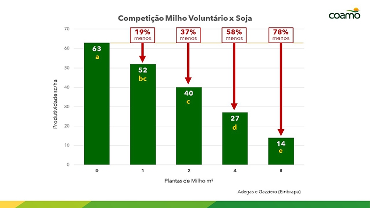 | Gráfico mostra perdas na produtividade da soja se o milho voluntário não for controlado corretamente |