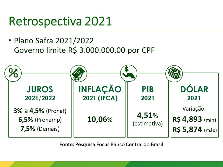 Ainda fazendo uma retrospectiva de 2021, o plano safra 2021/22 do governo limitou financiamento aos produtores em três milhões de reais por CPF, com juro agrícola de 3 a 4,5% Pronaf, 6,5% no Pronamp e 7,5% para os demais. A inflação ficou em 10,06% e o PIB em 4,51%. O dólar variou de R$ 4,893 a R$ 5,874. “O dólar ajudou muito nos preços dos produtos no ano passado”, destaca Gallassini.