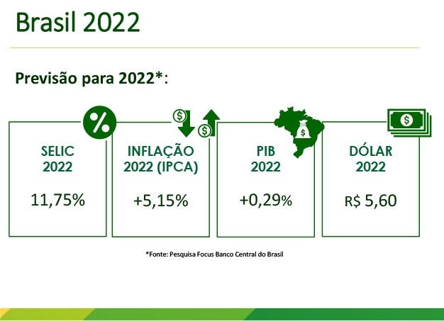 Para 2022, a previsão da a Selic é de 11,75%, com inflação (IPCA) de 5,15%, PIB de 0,29% e o dólar R$ 5,60.