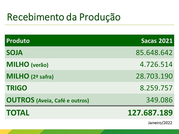 A Coamo recebeu em 2021, um total de 127.687.189 sacas de produtos. Foram 85.648.642 de soja, 4.726.514 de milho na primeira safra, 28.703.190 na segunda safra, 8.259.757 de trigo e 349.086 de outros produtos. “A safra de verão foi prejudicada pela falta de chuva e a segunda safra pela seca e pela geada. Ainda assim, foi uma grande produção e os preços compensaram o resultado do ano”, diz Gallassini.