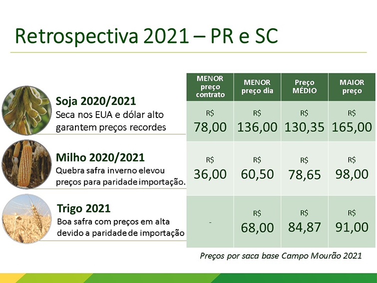 Em relação aos preços no Paraná e Santa Catarina, o menor valor pago pela soja em 2021 foi de R$ 136,00 e o maior R$ 165,00. Para o milho, o menor foi R$ 60,50 e o maior R$ 98,00. No trigo, o menor foi R$ 68,00 e o maior R$ 91,00. O menor preço de contrato foi de R$ 78,00 para a soja e R$ 36,00 para o milho.