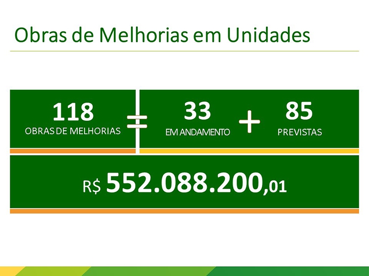 O presidente Executivo apresentou as obras e investimentos planejados para 2022/23. São diversas melhorias, ampliação e modernização em 118 obras distribuídas por toda a Coamo. Do total, 33 estão em andamento e 85 previstas para iniciar em breve, somando R$ 552.088.200,01. “Esses investimentos visam o bom atendimento aos cooperados. São obras focadas nas unidades operacionais, escritórios administrativos, armazéns de insumos, tudo para facilitar a vida do produtor, tanto no momento da entrega da produção e retirada de insumos, quanto no atendimento administrativo de loja de peças. Entre os investimentos em andamento estão a construção das novas unidades em Rio Brilhante e Ponta Porã, e ampliação e reestruturação do entreposto em Bandeirantes, no Mato Grosso do Sul. “Serão grandes unidades com o que há de mais moderno para atender os cooperados com agilidade e segurança”, observa.