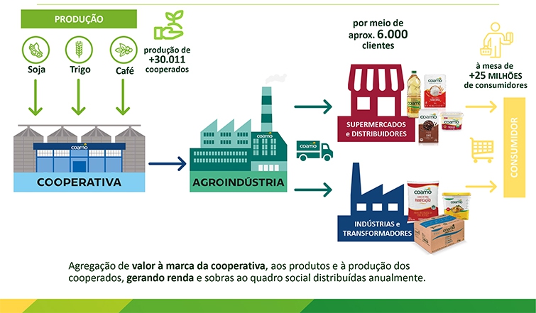 A Coamo conta com uma linha de produtos alimentícios e atua nos canais de varejo, com produtos que vão direto para as gôndolas dos supermercados, e no canal de Food Service, que atende outras indústrias, como padarias, por exemplo.