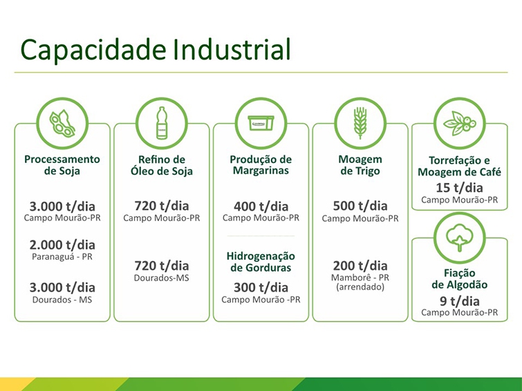 A Coamo conta com três indústrias de processamento de soja – Campo Mourão, Paranaguá e Dourados –, totalizando oito mil toneladas por dia de esmagamento de soja. Em Paranaguá e Dourados se produz o óleo, onde são refinadas 720 toneladas por dia em cada indústria. Dessas 1.440 toneladas, 400 são transformadas em margarinas e gorduras e são produzidas mais de 100 mil caixas por dia de óleo. “Isso dá dois milhões de frascos de óleo produzidos todos os dias”, frisa.