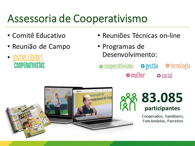 Em relação aos eventos, o diretor destaca que em função da pandemia, foram realizados no formato virtual. “Tivemos várias reuniões técnicas, sobre o mercado e um direcionado para as mulheres. Todos com grande participação dos cooperados e de seus familiares”, assinala.