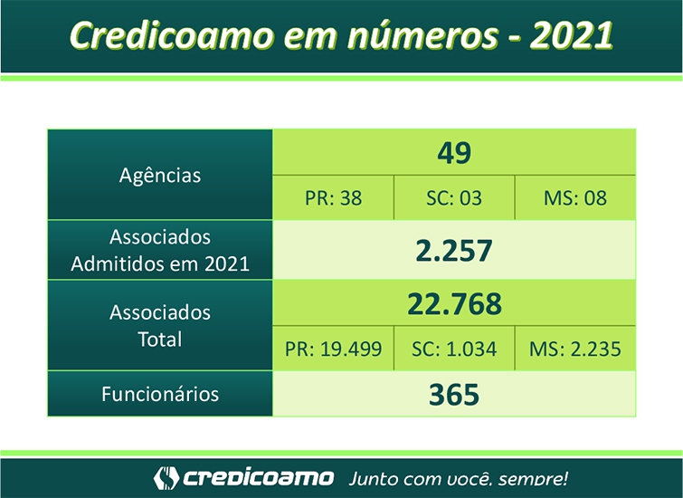 A Credicoamo conta com 22 mil cooperados e 365 funcionários em 49 agências, sendo 38 no Paraná, três em Santa Catarina e oito no Mato Grosso do Sul.