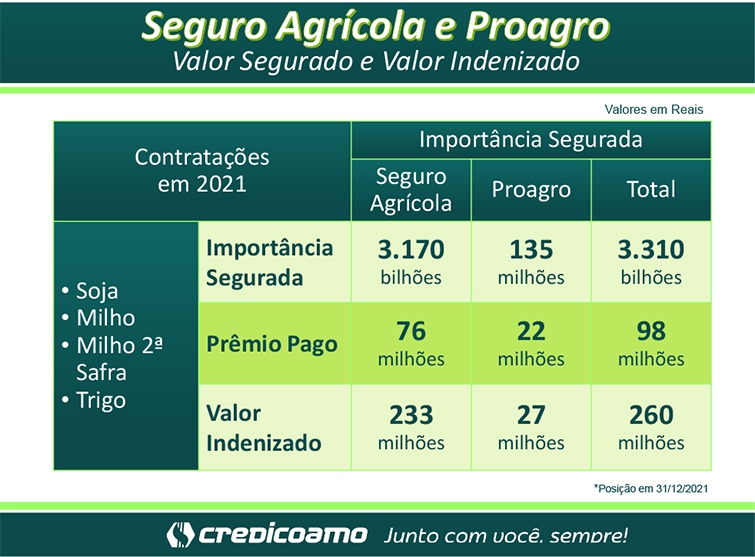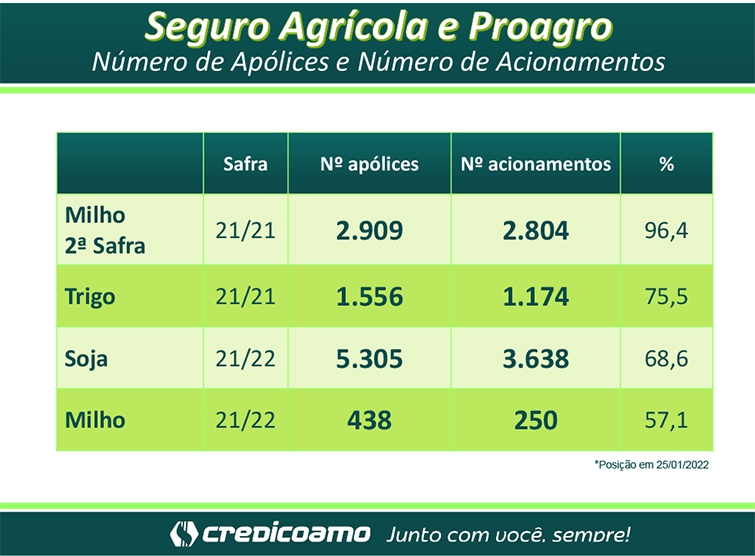 O seguro agrícola é um instrumento fundamental de proteção ao cooperado, pois garante a continuidade na atividade no caso de perdas. Em um ano de frustrações devido ao clima, essa ferramenta se torna ainda mais importante. Na segunda safra de milho de 2021 foram realizadas na Credicoamo um total de 2.909 apólices, sendo acionadas 2.804, representando 96,4% das apólices contratadas. Para o trigo foram 1.556 apólices com acionamento de 1.174, um percentual de 75,5%. Já na lavoura de soja que está começando a ser colhida, foram 5.305 apólices e até o final de janeiro já eram 3.638 acionamentos, 68,6% acionados em função dos eventos climáticos. No caso do milho de verão foram 438 apólices, sendo acionados 250 casos, 57,1%.