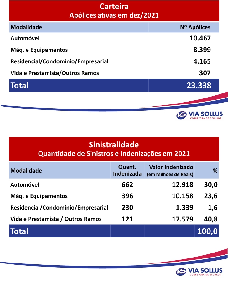 A Via Sollus Corretora de Seguros, empresa da Coamo, presta importante serviço para os cooperados da Coamo e Credicoamo, funcionários e comunidade. Até o final de 2021, a corretora contava com uma carteira de 23.338 apólices ativas, sendo 10.467 para automóveis, 8.399 de máquinas e equipamentos, 4.165 residencial/condomínio/empresarial e 307 de vida e prestamista. No ano passado foram realizadas 1.409 indenizações, que somam R$ 41.994 milhões.