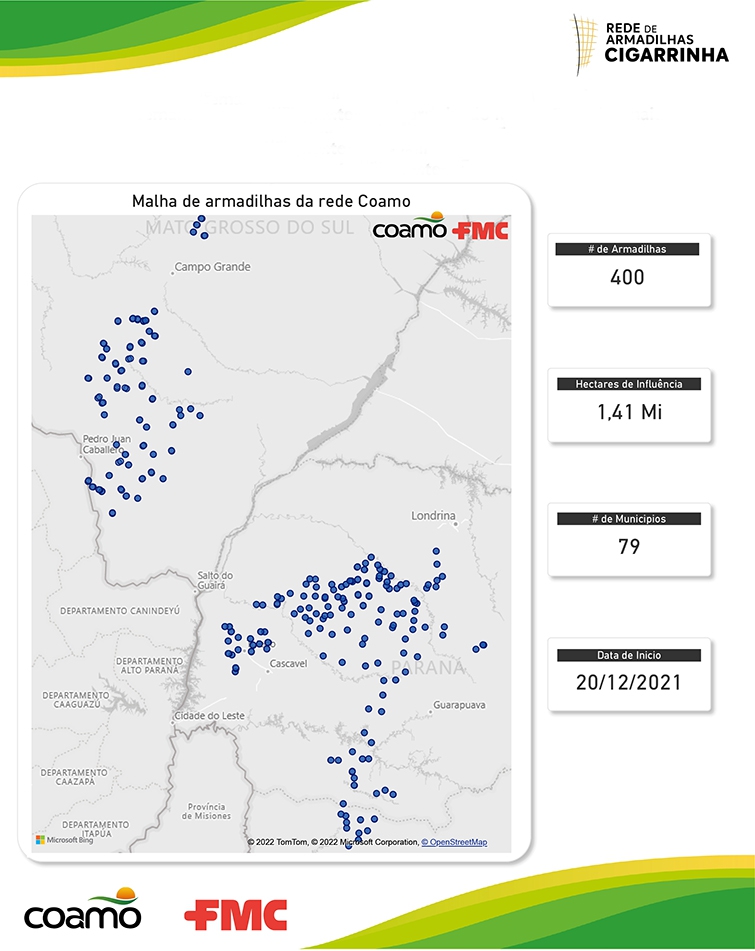 A Coamo e a parceira FMC Química do Brasil Ltda, estão desenvolvendo em conjunto um projeto de monitoramento de cigarrinhas por meio de uma rede de armadilhas instaladas estrategicamente em todo território de atuação da cooperativa. Esta ação é exclusiva para a Coamo e tem como objetivo gerar informações para os cooperados sobre esta praga.