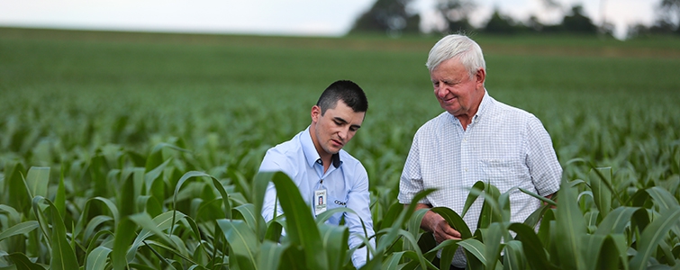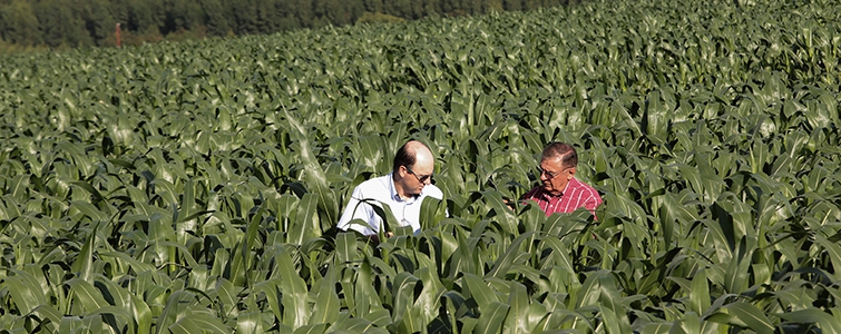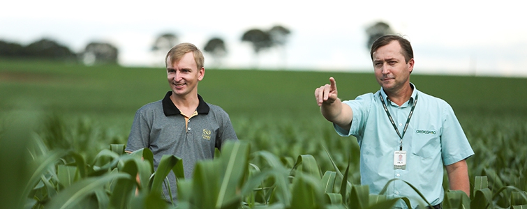| Em Nova Santa Rosa (PR), cooperado Valdemar Eichlt colheu uma média de 14 sacas de soja por alqueire. Ele acompanha o bom desenvolvimento da segunda safra de milho com o engenheiro agrônomo Evandro Cardoso da Silva |