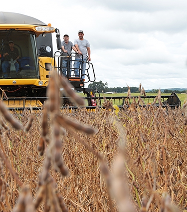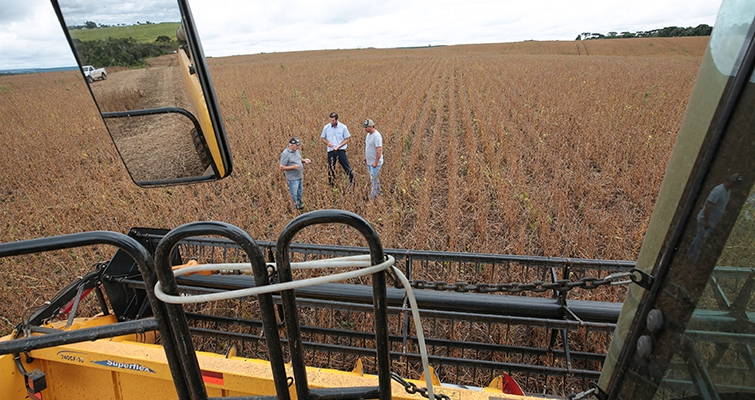 | Cooperados Luiz e Gilberto Fabrício acompanham a colheita do soja com o engenheiro agrônomo, Alcione Dalla Giacomassa, em Palmas (PR) |
