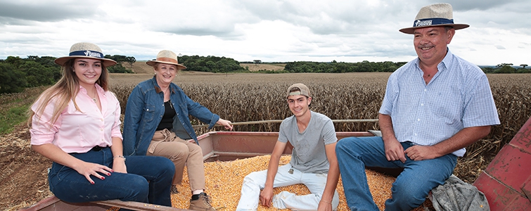 | Cooperado Luiz Fernando da Rocha Loures com a esposa Claudia e os filhos Maria Fernanda e Fernando. Trabalho em família em mais uma safra de verão em Pinhão |