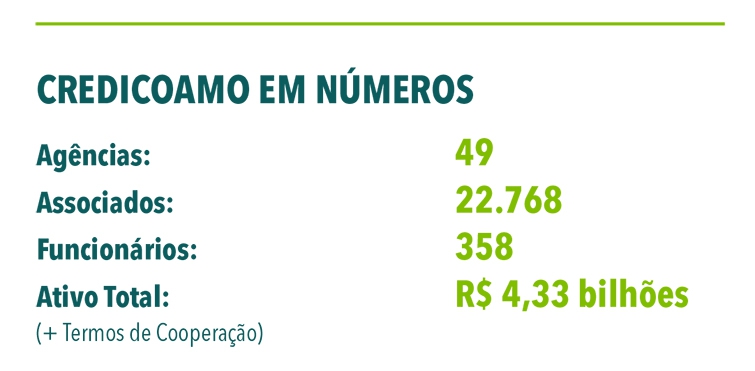 De acordo com o presidente Executivo da Credicoamo, Alcir José Goldoni, mesmo diante deste cenário, a Credicoamo buscou alinhar inovações, crescimento sustentável, expansão e abertura de novas agências, além de constantes novidades no portfólio de produtos e serviços aos associados. “Nesse contexto, a compreensão e a participação ativa dos associados geraram o alicerce e a segurança para o crescimento que a Credicoamo vem apresentando. Com o sentimento de pertencimento dos associados, que estão, cada vez mais, transformando a sua cooperativa de crédito em seu domicílio financeiro, o ano se apresentou como o melhor da história da Credicoamo.”