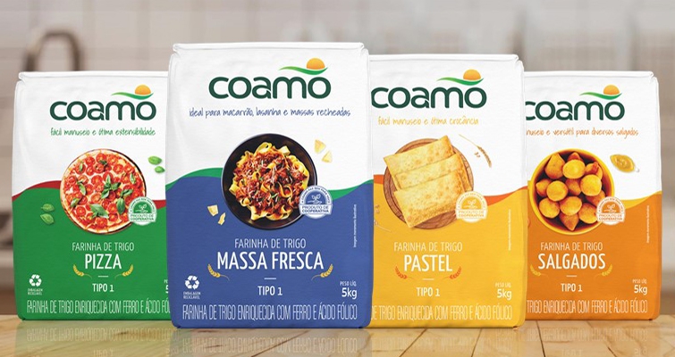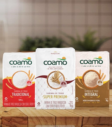 A Coamo conta com diversos tipos de farinhas de trigo e todas passaram por mudanças. “Há a utilização do fundo igual para as farinhas, para formação de bloco de gôndola e gerando mais destaque entre as marcas de farinhas. Em toda a imagem simula uma janela com o produto. A Farinha de Trigo tem como cor predominante o vermelho, e passa a ter uma área branca para ressaltar o protagonismo da marca na nova embalagem. A Farinha de Trigo Coamo Integral segue com tons terrosos e amarelo, remetendo à textura natural. Já para a farinha de Trigo Coamo Super Premium, foi escolhido um grafismo delicado de trigo que traduz o requinte do produto. Ela tem a referência visual da embalagem anterior, seguindo as cores vinho, bege e branco, para familiarização do cliente”, explica do chefe do Departamento de Marketing e Trade Marketing da Coamo, Edson Watanabe.