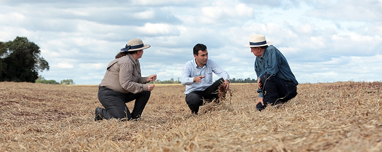 | Engenheiro agrônomo José Petruise Ferreira Júnior mostra a palhada, uma das características em toda a área de produção na propriedade |