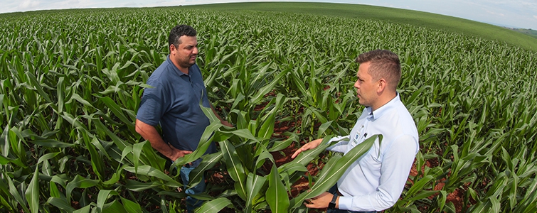 | Engenheiro agrônomo Mayckon Roberto Pedreira, da Coamo em Cruzmaltina (PR), acompanha desenvolvimento da segunda safra de milho com o cooperado Alex da Silva |