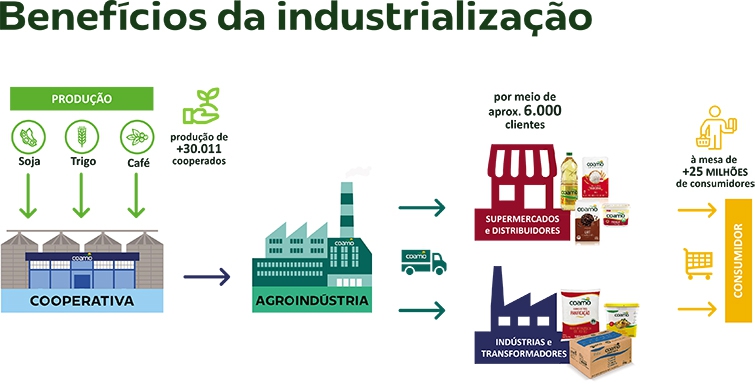 O óleo de soja com a marca Coamo chegou aos consumidores, inicialmente pela parceria com terceiros, diz Wagner Schneider, gerente Comercial de Alimentos. “Depois, com o aumento da demanda e a visão da diretoria, a Coamo construiu a sua própria fábrica de refino de óleo nos anos 1990. Do óleo em lata evoluímos bastante e chegamos à embalagem pet. Todo esse trabalho é feito para agregar mais valor à produção dos cooperados.” No processo de verticalização industrial vieram na sequência as linhas de margarinas e gorduras vegetais.