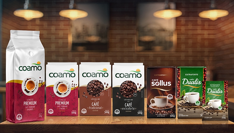 Aquele cheirinho de café que acabou de ficar pronto é um convite irrecusável para um momento agradável. O café conquista a cada ano milhares de novos consumidores e, por isso, na linha de produção de alimentos da cooperativa, o café faz parte do portifólio de produtos há mais de duas décadas. Recentemente com rebranding da linha alimentícia da Coamo, os cafés também mudaram de layout. Se mantém a ideia de padronização do mesmo fundo para formação de bloco de gôndolas e com uma imagem central para cada um. O que muda na embalagem de uma para a outra é a cor de cada categoria.