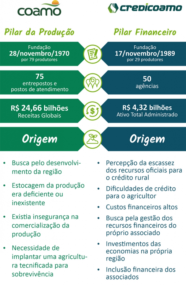 O cooperativismo é resultado dos sonhos de pessoas em busca da solução para os seus problemas e necessidades, independente das suas atividades. Foi assim, que em 28 de novembro de 1970 surgiu a Coamo e, em 17 de novembro de 1989, a Credicoamo, nos segmentos agropecuário e de crédito, respectivamente.